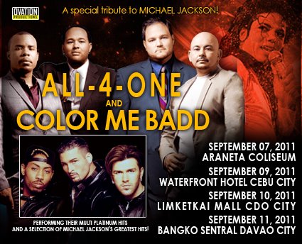 The concert event in the Philippines in September 2011 was a back-to-back performance by American R&B groups All-4-One and Color Me Badd. Presented by Ovation Productions,