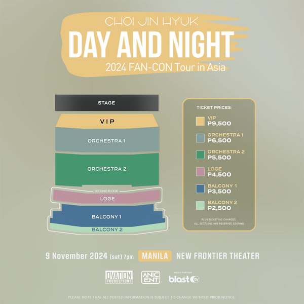 Choi Jin Hyuk held his "Day and Night" fancon in Manila on November 9, 2024, at the New Frontier Theater. This was his first time holding a fan meeting in Manila. He showcased his singing and acting talents, including a special song for Filipino fans, and also engaged in games and even hugs.