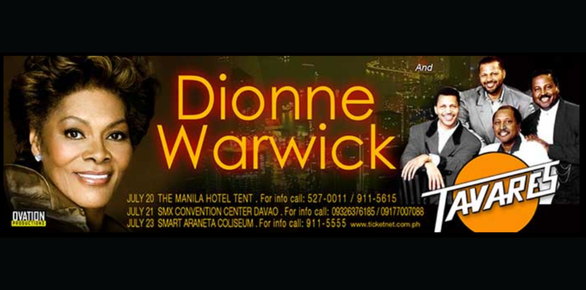 Dionne Warwick's 2013 live performances in the Philippines included shows at The Manila Hotel Tent, SMX Convention Center in Davao, and Smart Araneta Coliseum in Quezon City. She performed her hits with special guest Tavares, and tickets were sold for the different venues.