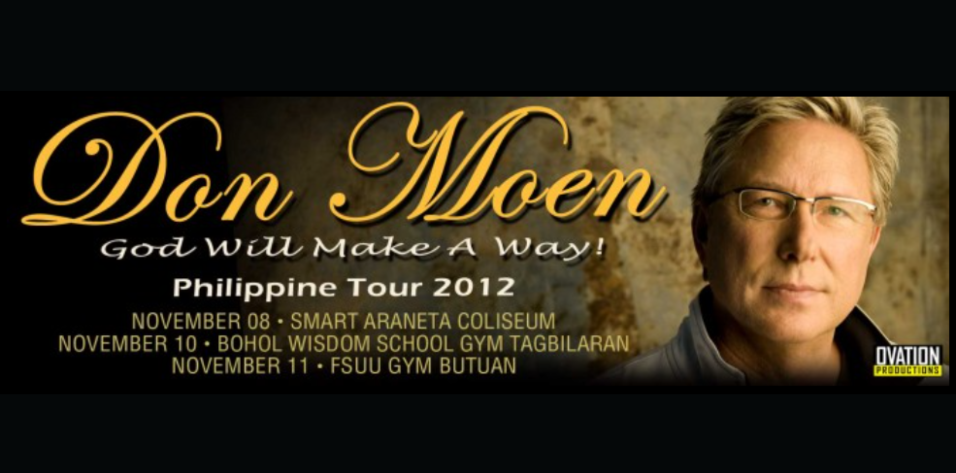 Don Moen held the "God Will Make A Way! Philippine Tour 2012" in November 2012, with a major concert in Manila at the Smart Araneta Coliseum on November 8th, and also performed in Tagbilaran (Bohol) on November 10th and Butuan on November 11th.