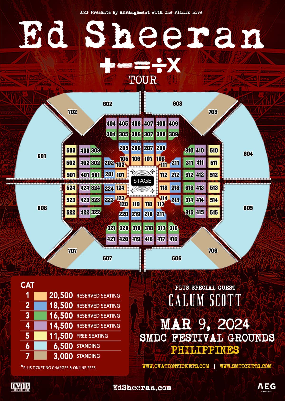 Ed Sheeran is bringing his + - = ÷ x Tour to Manila on March 9, 2024, at the SMDC Festival Grounds. Tickets will go on sale on October 26 at 12 p.m. via Ovation Productions and SM Tickets.