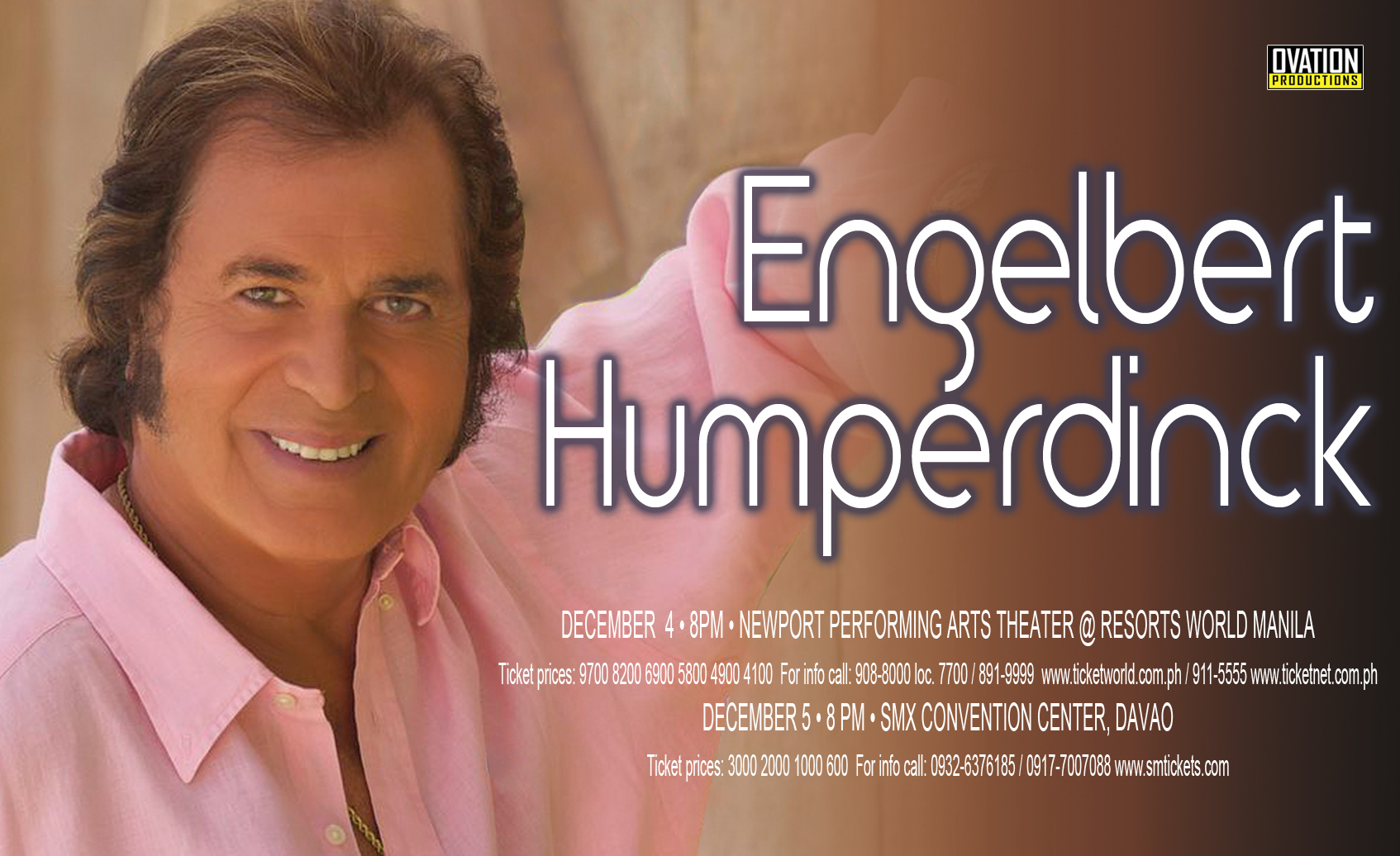 Engelbert Humperdinck performed in the Philippines for two shows: on December 4th at the Newport Performing Arts Theater in Manila (Resorts World Manila) and on December 5th at the SMX Convention Center in Davao.