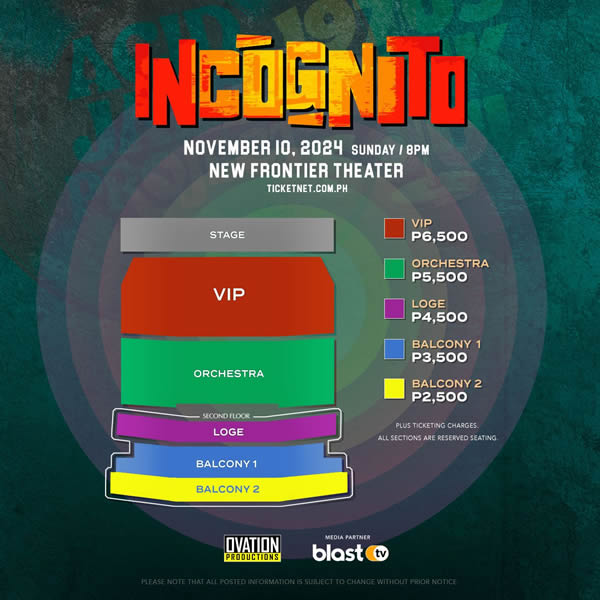 Incognito, the British acid jazz band, is performing in Manila on November 10, 2024, at the New Frontier Theater. This concert marks the band's return to Manila after a decade. Fans can expect a night of smooth jazz, funk, and soulful music, with hits like "Always There" and "Still a Friend of Mine". The concert is presented by Ovation Productions.