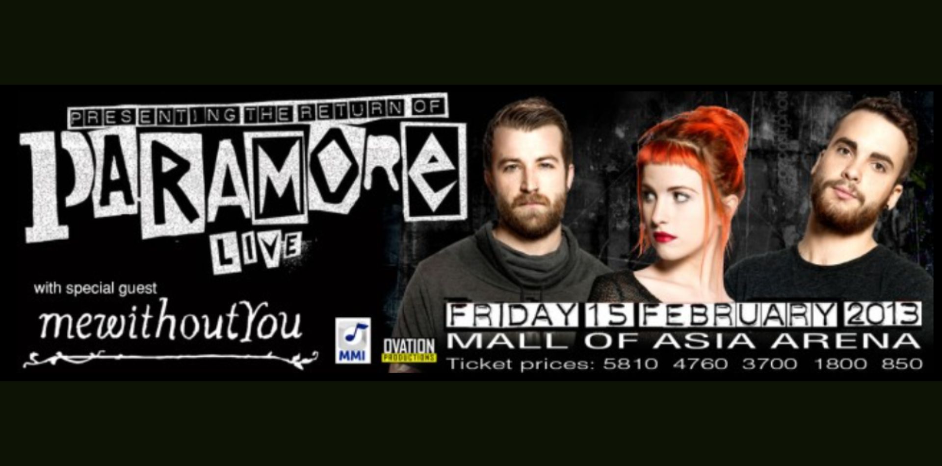 Paramore's 2013 Manila concert was their second performance in the Philippines, held on February 15, 2013, at the Mall of Asia Arena. The concert, presented by Ovation Productions and Music Management International, featured a setlist including songs from their self-titled fourth album and previous hits.