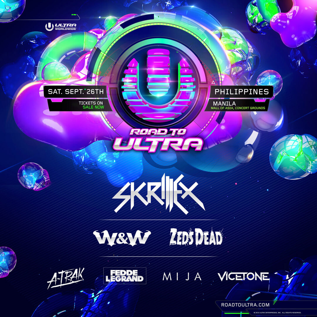 "Road to Ultra 2015" refers to the 2015 events of the Road to Ultra (RTU) festival series, a single-stage event concept by Ultra Worldwide that brings the same top electronic music artists and cutting-edge stage production (visuals, lighting, pyrotechnics) to various international locations to build excitement for the main Ultra Music Festivals. Major 2015 events included the debut of Road to Ultra: Philippines on September 26, 2015, at the Mall of Asia Concert Grounds, featuring headliner Skrillex.